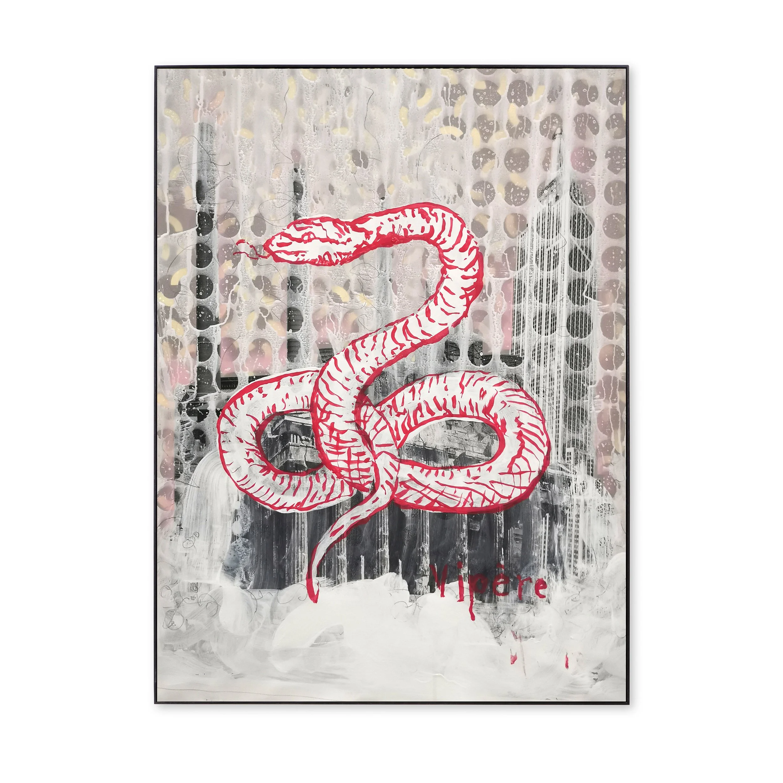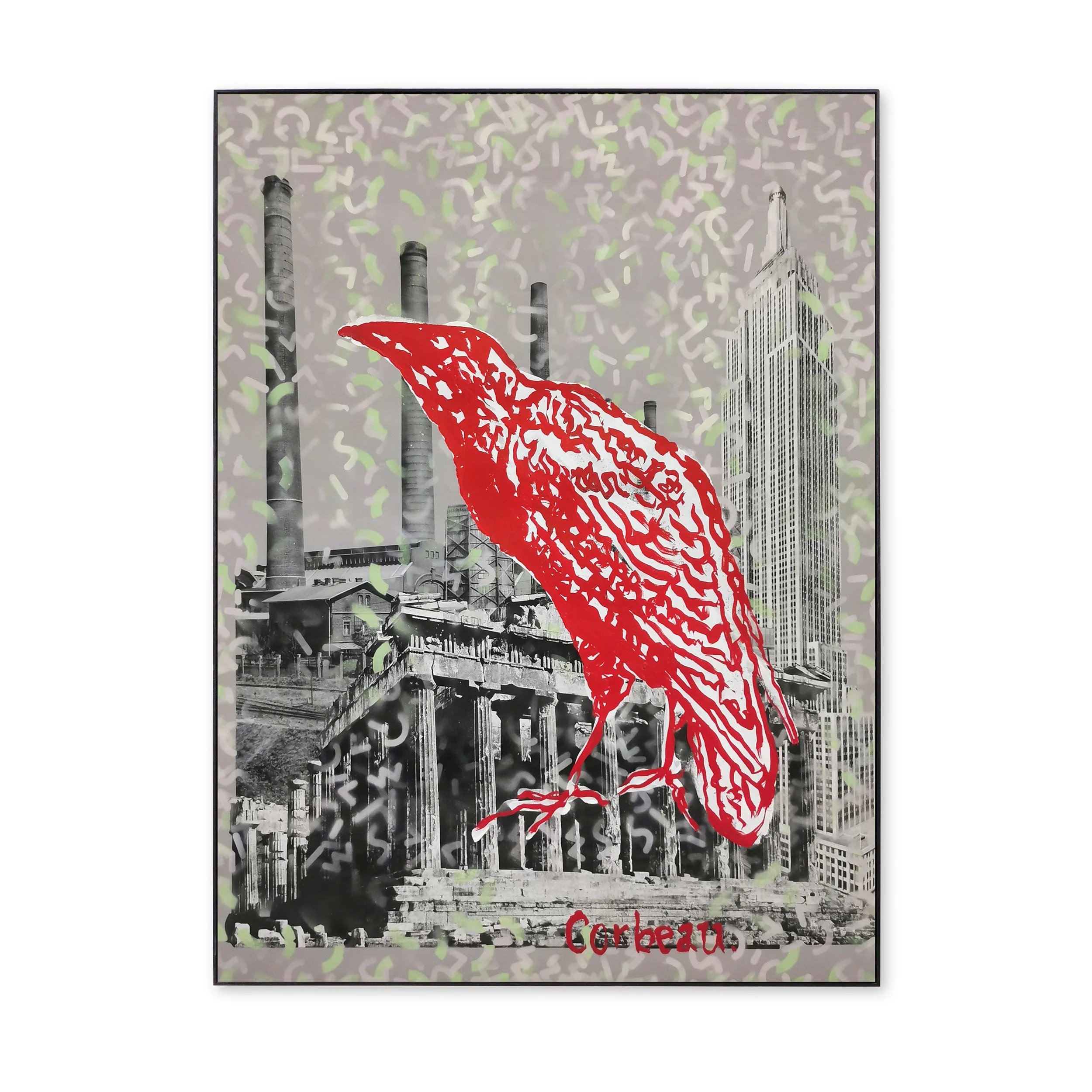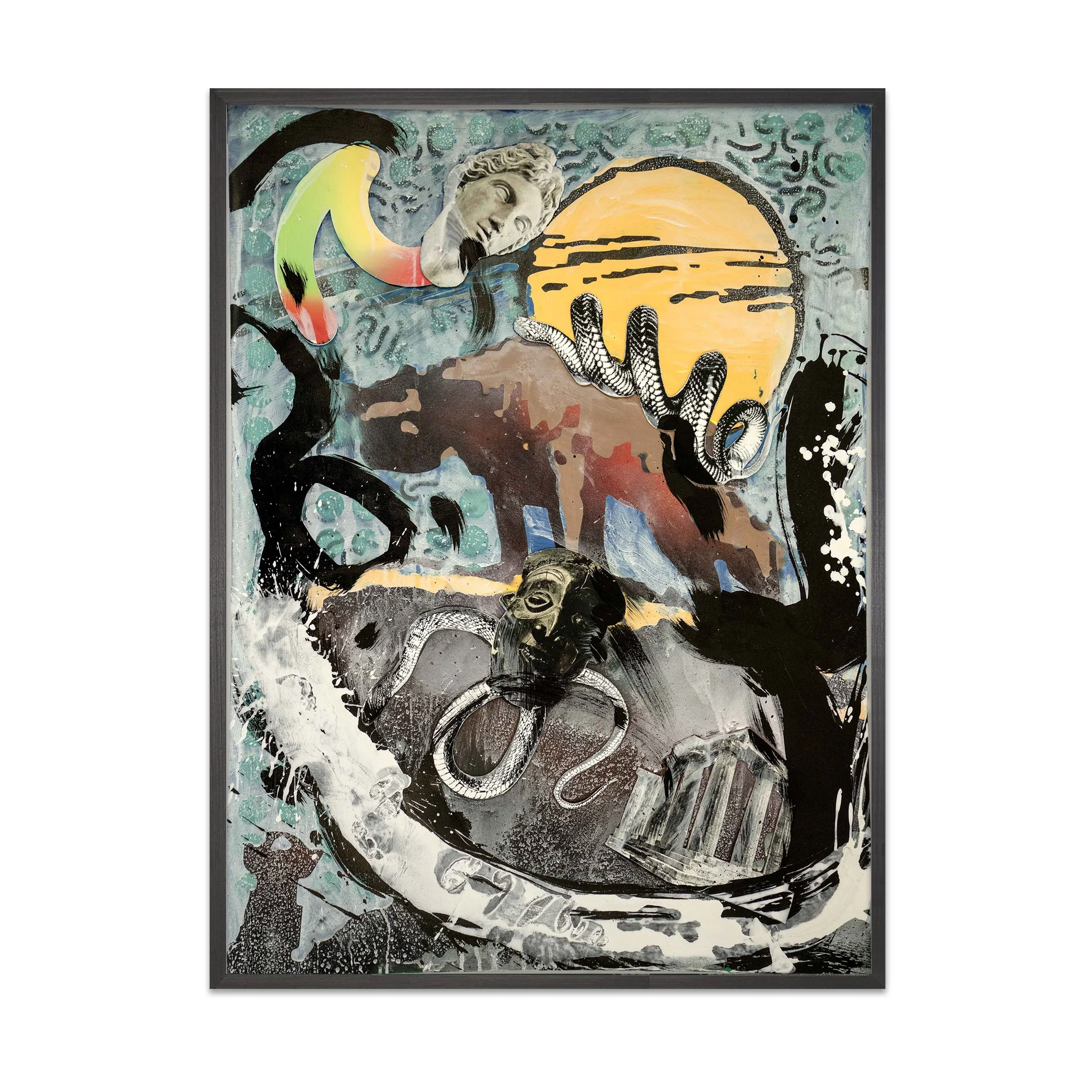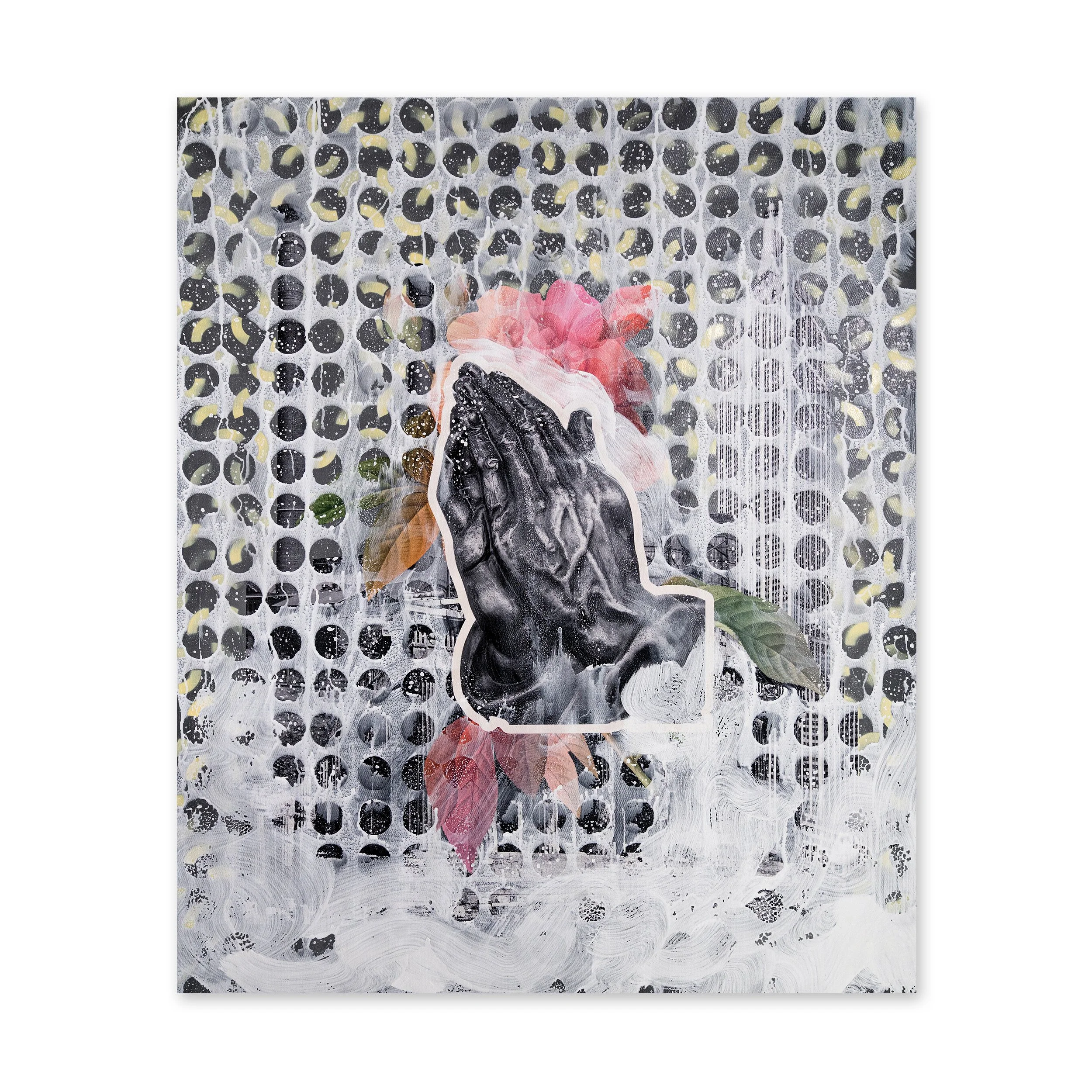 In Jean-Pierre Brown’s new series of large-scale painterly collages we see images of humansbattling violently with nature. We see angelic images of beautiful women fighting to the death with wild and dangerous animals. We see images of war, industry, money, greed and prayer. We seearchitectural monuments built tocelebrate the glory of god and capitalism. Temples, factories and skyscrapers constructed to illustrate the heights of human prowess and ingenuity.